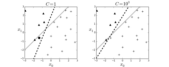 # The left panel shows the resulting boundary (dashed line) with $C=1$ as the # regularization parameter. The right panel is for $C=1000$. The gray line is the # boundary used to assign the class membership for the synthetic data. The dark # circle is the point that logistic regression categorizes incorrectly.
