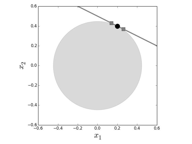 The solution of the constrained $L_2$ minimization problem is at the point # where the constraint (dark line) intersects the $L_2$ ball (gray circle) # centered at the origin. The point of intersection is indicated by the dark # circle. The two neighboring squares indicate points on the line that are close # to the solution.