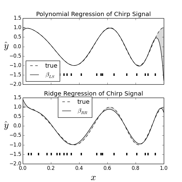 The top figure shows polynomial regression and the lower panel shows # polynomial ridge regression. The ridge regression does not match as well # throughout most of the domain, but it does not flare as violently at the ends. # This is because the ridge constraint holds the coefficient vector down at the # expense of poorer performance along the middle of the domain.