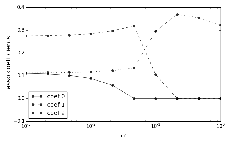 # # # # # # ## Lasso # # Lasso regression follows the same basic pattern as ridge regression, # except with the $L_1$ norm in the objective function. # # $$ # \min_{\boldsymbol{\beta}\in\mathbb{R}^p}\Vert # y-\mathbf{X}\boldsymbol{\beta}\Vert^2 +\alpha\Vert\boldsymbol{\beta}\Vert_1 # $$ # # The interface in Scikit-learn is likewise the same. # The following is the same problem as before using lasso # instead of ridge regression, # In[ ]: X = np.matrix([[1,2,3], [3,4,5]]) y = np.matrix([[1,2]]).T from sklearn.linear_model import Lasso lr = Lasso(alpha=1.0,fit_intercept=False) _=lr.fit(X,y) print(lr.coef_) # As before, we can use the optimization tools in Scipy to solve this # also, # In[ ]: from scipy.optimize import fmin obj = 1/4.*(X*beta-y).norm(2)**2 + beta.norm(1)*l f = S.lambdify((b0,b1,b2),obj.subs(l,1.0)) g = lambda x:f(x[0],x[1],x[2]) fmin(g,[0.1,0.2,0.3]) # **Programming Tip.** # # The `fmin` function from Scipy's optimization module uses an # algorithm that does not depend upon derivatives. This is useful # because, unlike the $L_2$ norm, the $L_1$ norm has sharp corners # that make it harder to estimate derivatives. # # # # This result matches the previous one from the # Scikit-learn `Lasso` object. Solving it using Scipy is motivating # and provides a good sanity check, but specialized algorithms are # required in practice. The following code block re-runs the lasso # with varying $\alpha$ and plots the coefficients in # [Figure](#fig:regularization_004). Notice that as $\alpha$ increases, all # but one of the coefficients is driven to zero. Increasing $\alpha$ # makes the trade-off between fitting the data in the $L_2$ sense # and wanting to reduce the number of nonzero coefficients # (equivalently, the number of features used) in the model. For a # given problem, it may be more practical to focus on reducing the # number of features in the model (i.e., large $\alpha$) than the # quality of the data fit in the training data. The lasso provides a # clean way to navigate this trade-off. # # The following code loops over a set of $\alpha$ values and # collects the corresponding lasso coefficients to be plotted # in [Figure](#fig:regularization_004) # In[ ]: o=[] alphas= np.logspace(-3,0,10) for a in alphas: clf = Lasso(alpha=a,fit_intercept=False) _=clf.fit(X,y) o.append(clf.coef_) # In[ ]: fig,ax=subplots() fig.set_size_inches((8,5)) k=np.vstack(o) ls = ['-','--',':','-.'] for i in range(k.shape[1]): _=ax.semilogx(alphas,k[:,i],'o-', label='coef %d'%(i), color='k',ls=ls[i], alpha=.8,) _=ax.axis(ymin=-1e-1) _=ax.legend(loc=0) _=ax.set_xlabel(r'$\alpha$',fontsize=20) _=ax.set_ylabel(r'Lasso coefficients',fontsize=16) fig.tight_layout() # # #