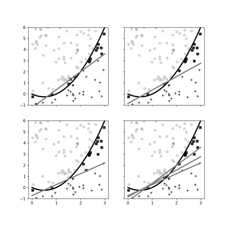 The individual perceptron classifiers embedded in the AdaBoost classifier are shown along with the mis-classified points (in black). Compare this to the lower right panel of [Figure](#fig:ensemble_003).