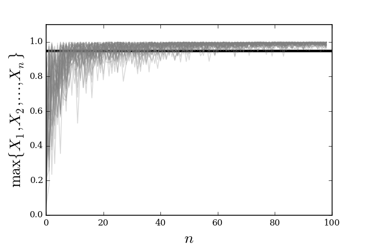 $$ \mathbb{P}\left(\omega\in\Omega \colon\lim_{n\rightarrow\infty} X_n(\omega)=X(\omega) \right)=1 $$Example. To get some feel for the mechanics of this kind of convergence consider the following sequence of uniformly distributed random variables on the unit interval, $X_n \sim \mathcal{U}[0,1]$. Now, consider taking the maximum of the set of $n$ such variables as the following,
