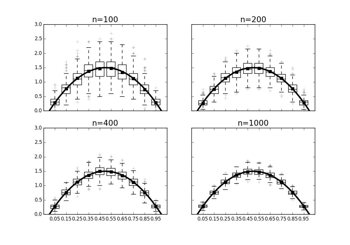 $$ \sup_{p\in\mathscr{P}(L)} R(p,\hat{p}) \le C_0 \left(\frac{1}{n}\right)^{\frac{2}{d+2}} $$where the constant $C_0$ is a function of $L$. There is a theorem [wasserman2004all] that shows this bound in tight, which basically means that the histogram is a really powerful probability density estimator for Lipschitz functions with risk that goes as $\left(\frac{1}{n}\right)^{\frac{2}{d+2}}$. Note that this class of functions is not necessarily smooth because the Lipschitz condition admits non-smooth functions. While this is a reassuring result, we typically do not know which function class (Lipschitz or not) a particular probability belongs to ahead of time. Nonetheless, the rate at which the risk changes with both dimension $d$ and $n$ samples would be hard to understand without this result. Figure shows the probability distribution function of the $\beta(2,2)$ distribution compared to computed histograms for different values of $n$. The box plots on each of the points show how the variation in each bin of the histogram reduces with increasing $n$. The risk function $R(p,\hat{p})$ above is based upon integrating the squared difference between the histogram (as a piecewise function of $x$) and the probability distribution function.