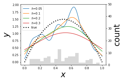 $$ R(p,\hat{p}) = \int \mathbb{E}(p(x) -\hat{p}_h(x))^2 dx \le L^2 h^2 d + \frac{C}{n h^d} $$This upper bound is minimized by choosing