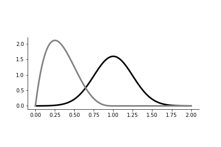 $$ \mathbb{P}(V\ge x) \ge \mathbb{P}(W\ge x) $$for all $x\in \mathbb{R}$ with strict inequality for at least one $x$. The term stochastically smaller means the obverse of this. For example, the black line density function shown in Figure is stochastically larger than the gray one.