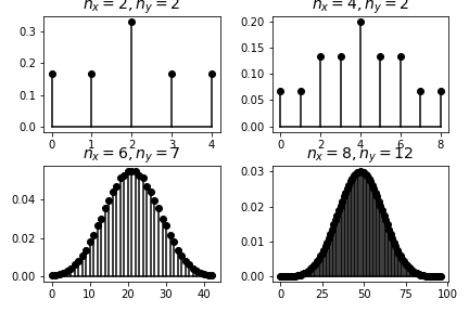 These are shown in Figure and approach a normal distribution for large $n_x,n_y$, with the following mean and variance,
