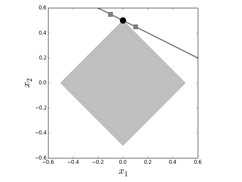 The diamond is the $L_1$ ball in two dimensions and the line is the constraint. The point of intersection is the solution to the optimization problem. Note that for $L_1$ optimization, the two nearby points on the constraint (squares) do not touch the $L_1$ ball. Compare this with [Figure](#fig:regularization_001).