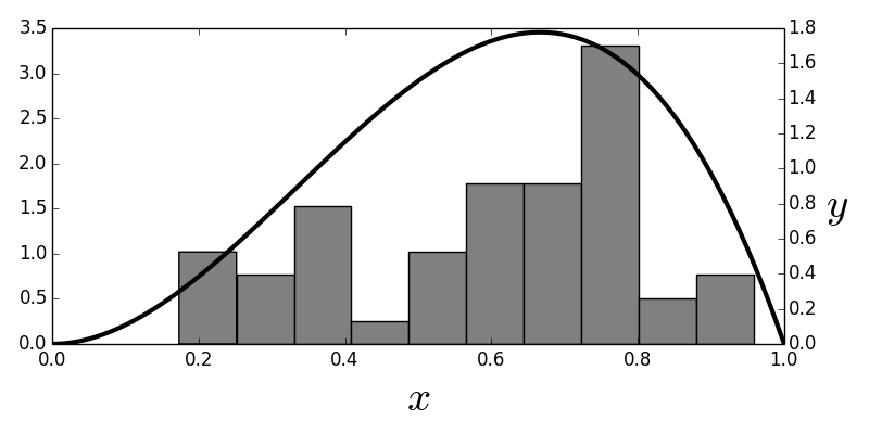 The $\beta(3,2)$ distribution and the histogram that approximates it.
